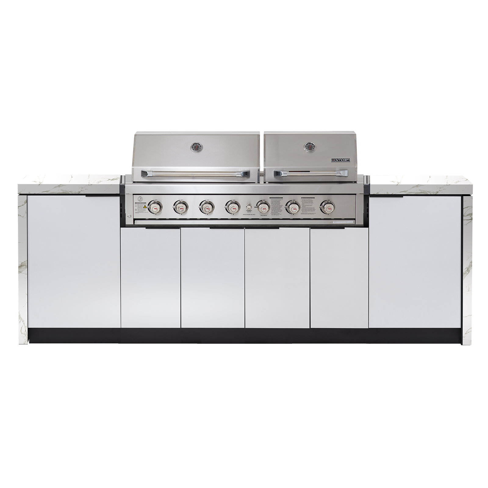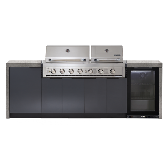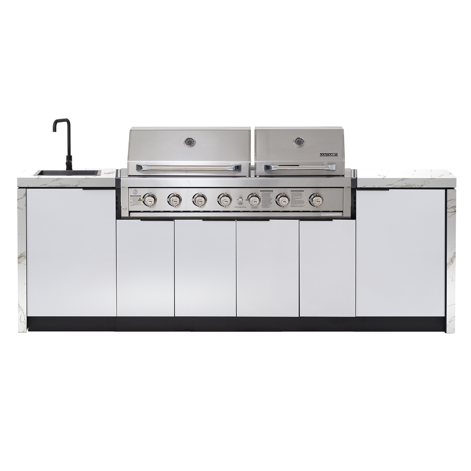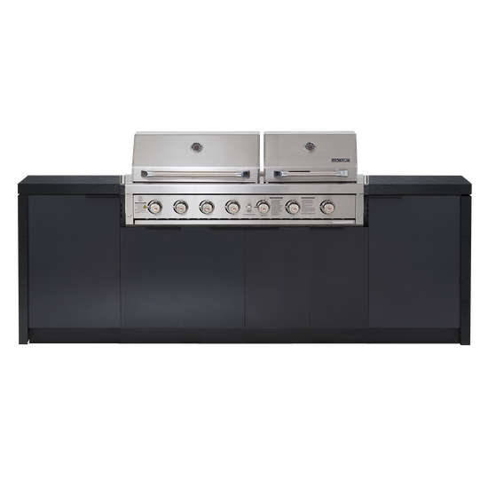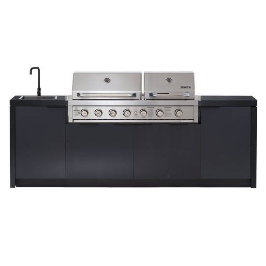 One of lifes great pleasures is cooking for family and friends outdoors. Integrating the Gasmaster Hero Twin Hood BBQ into our custom cabinetry, this dual hooded outdoor kitchen gives you the versatility to cook for any sized group. Whether you're cooking a quiet dinner for two under the smaller hood or entertaining a large group under both hoods, you can do it in style with this snazzy Cabinex kitchen.