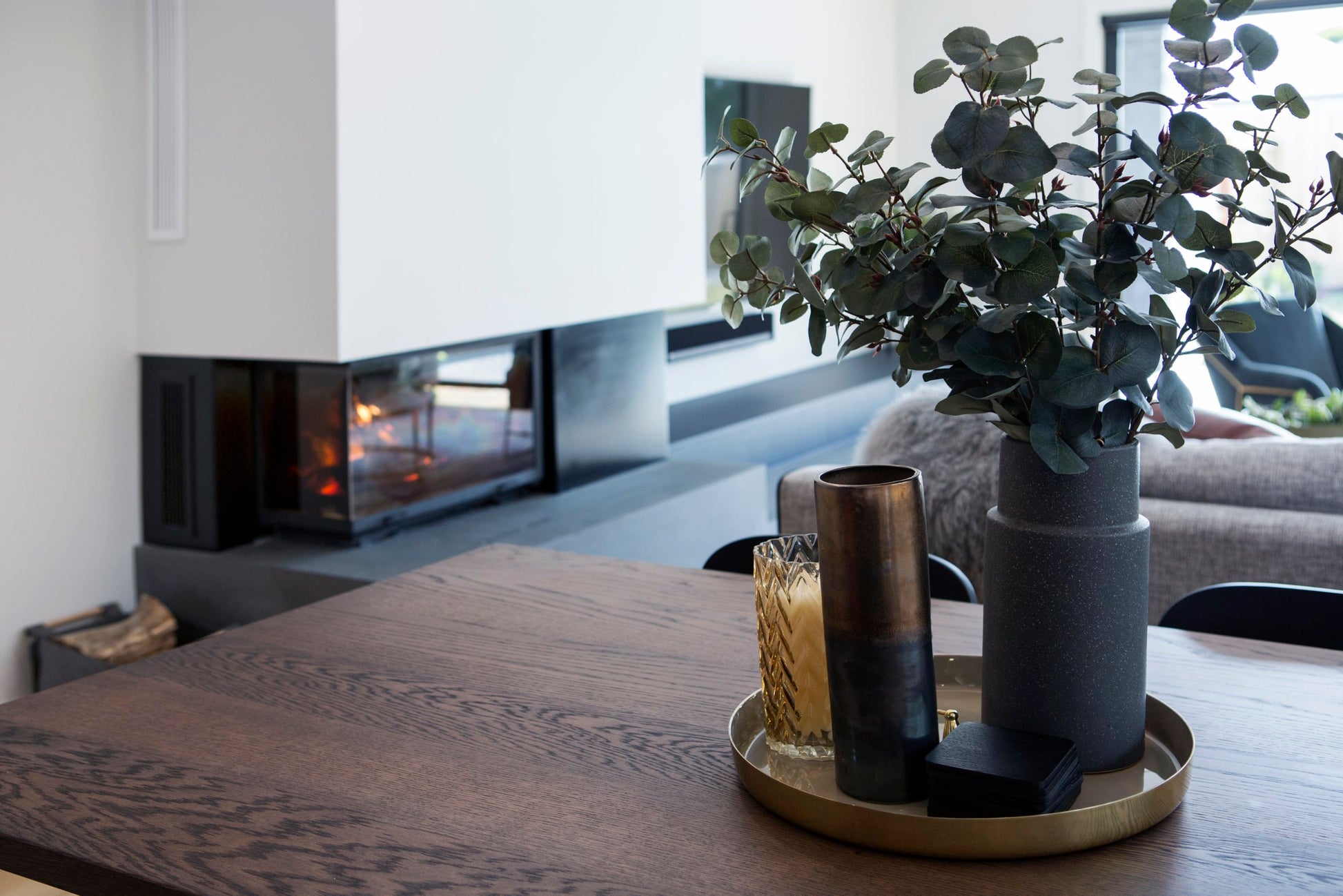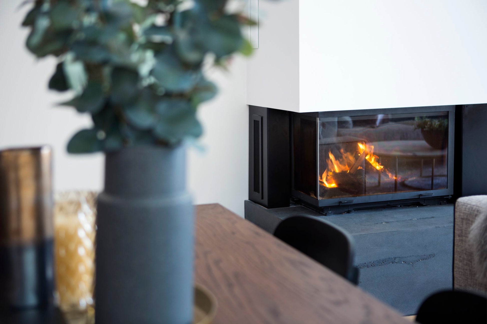 Offering a visual impact from all corners of the room with a huge, panoramic glass window wrapping itself around the side of the firebox.
