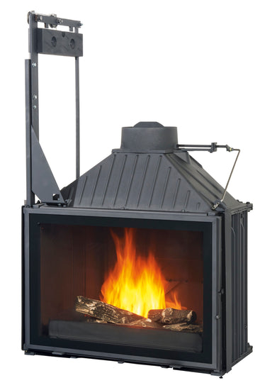 Cheminees Philippe's original double opening door system is demonstrated to its full advantage with the whole front sliding up for a stunning open fire or revert to a high performance slow combustion heater when the door is closed.